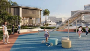 Fior 1 provides access to Mina Beach (12,600 sqm), a 430-berth superyacht marina accommodating vessels up to 100m, and a 500m canal pool within Rashid Yachts & Marina. The district also features landscaped parks and a floating yacht club, shaping a Riviera-style waterfront setting.