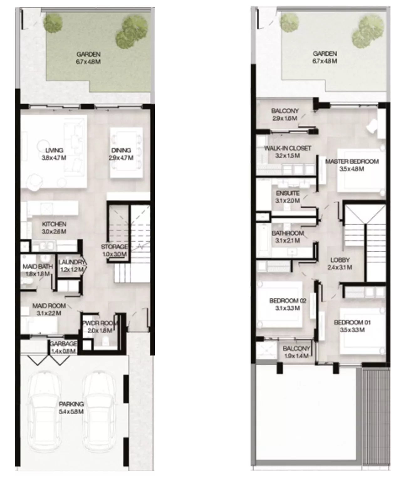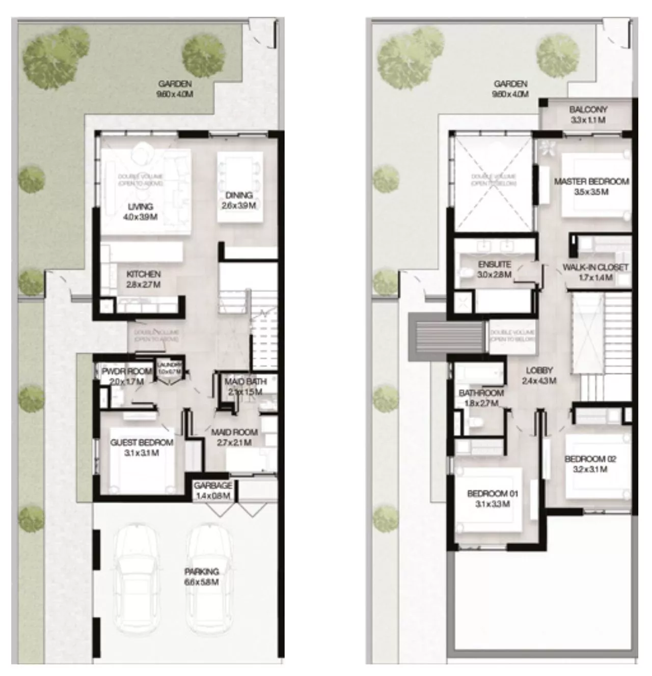 The total living area of the properties ranges between 2,345 sq. ft to 3,004 sq. ft, while the layouts include quarters for domestic staff, a balcony and a 2-car garage, in addition to generously-sized living and dining spaces, for the utmost convenience of homeowners. It is worth noting that the standard townhouses boast 2 levels (G+1), whilst the family townhouses feature 3 levels (G+1+R). That being said, the roof level in the latter property type houses an extra balcony and an extra family room, which will provide more space for quality family time. Each townhouse shares an unparalleled view of the landscaped gardens within the development.