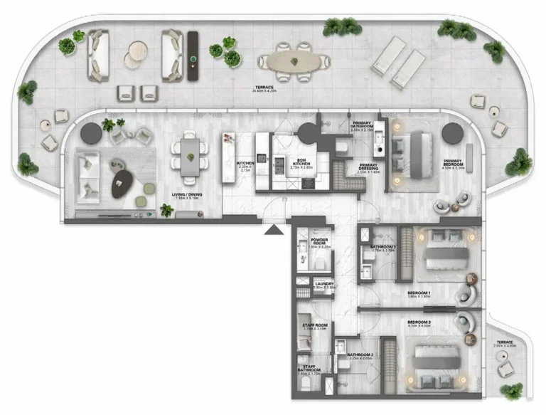 Bella by Passo from BEYOND Developments denotes the final chapter of the Passo series, emerging as a sculptural residential landmark on one of the last prime plots of Palm Jumeirah West Crescent. The project hosts 268 residences across 14 floors, including 2–4BR apartments, 3 penthouses (7,346–7,871 sq.ft.), and 3 Beach Mansions (~12,382 sq.ft.), starting at AED 6.2M with a 60/40 payment plan and handover in Q3 2029. The tower boasts 250 meters of private beachfront and uninterrupted views of the Arabian Gulf, Atlantis The Royal, and Dubai skyline.