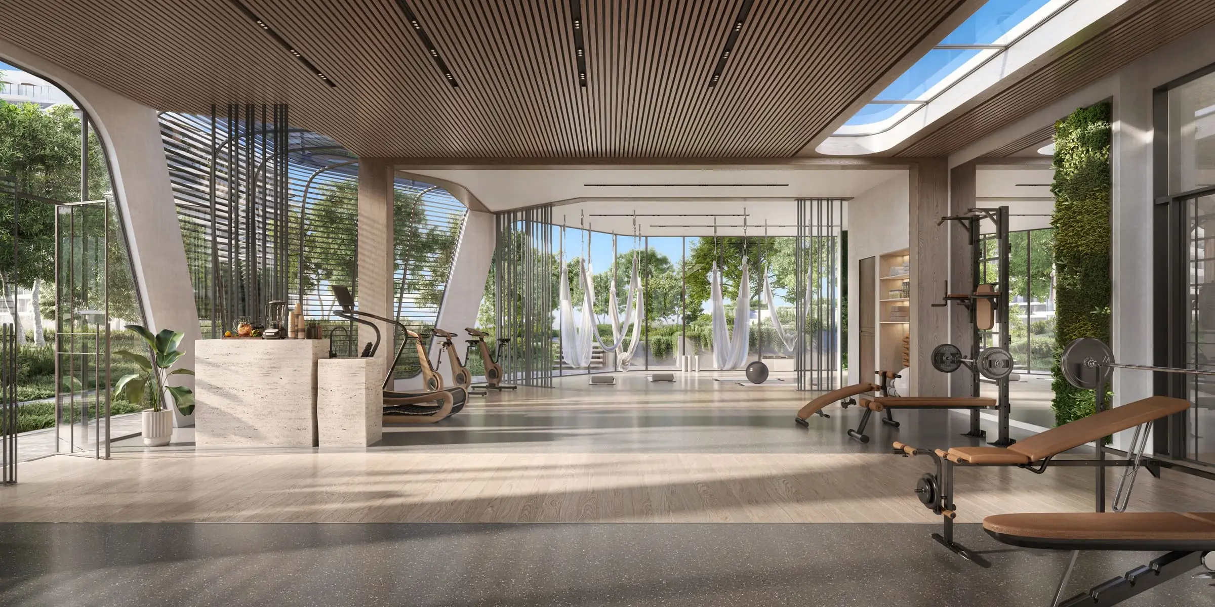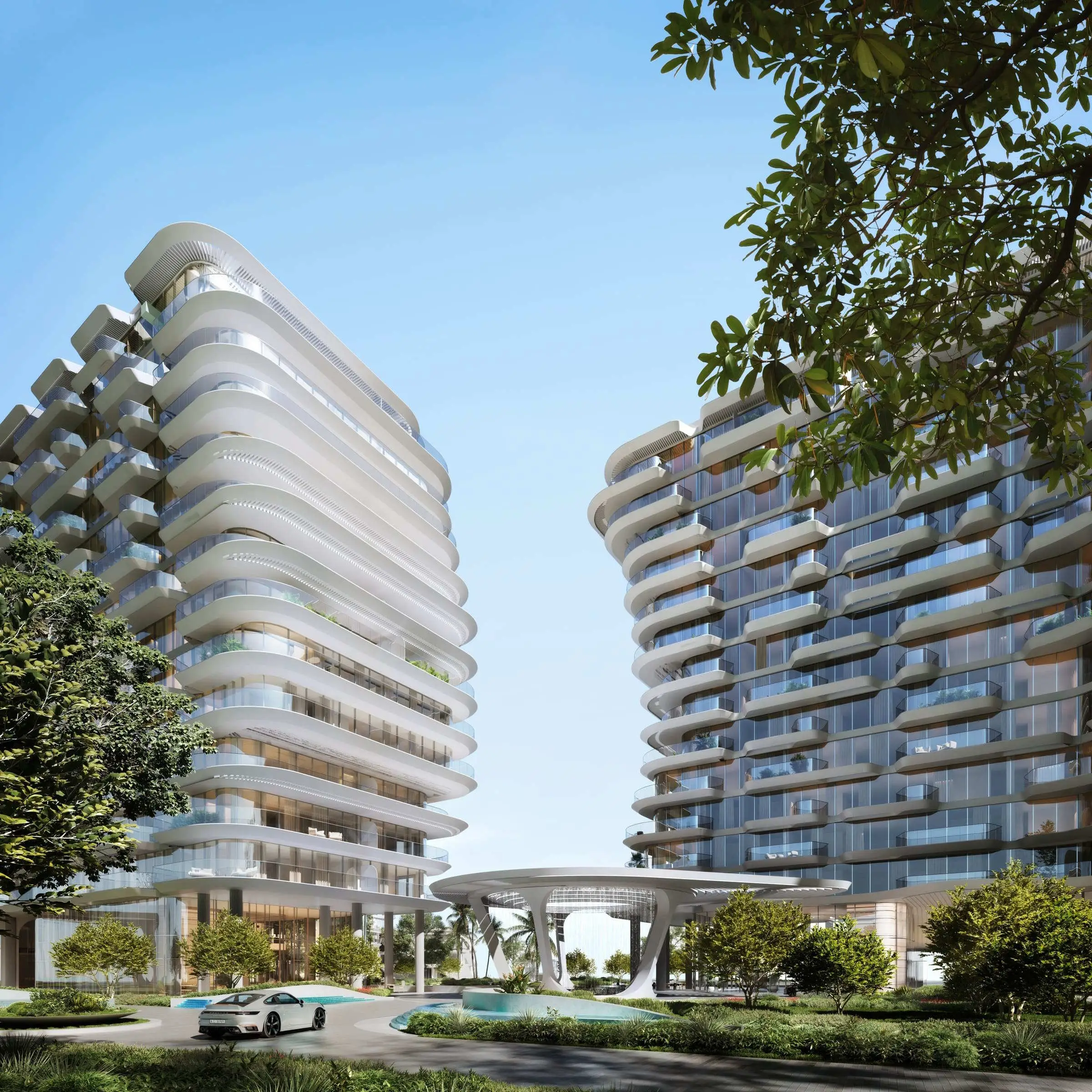 A sculptural arrival experience with a glass pavilion sets the tone for luxury living and resort-style hospitality.