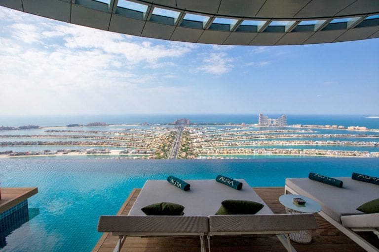 On the top floor of the tower is a unique observation deck, The View at The Palm, which offers a panoramic view of the Dubai coast and Palm Jumeirah Island from a height of 240 meters. In addition, on the 50th floor is one of the highest-lying landscape pools in the world. The building also has two podium-level pools and a restaurant on the 52nd floor.