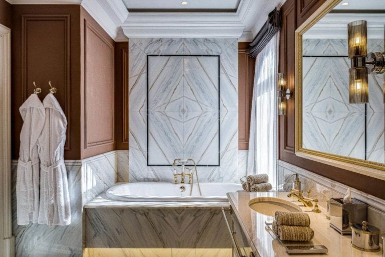 The decor of the bathrooms is made in the exclusive style of the Italian company Devon & Devon, and with the use of expensive materials. The design of the kitchen areas has been planned and implemented by the French company La Cuisine Française. Here you can note the exquisite heraldic lines, as well as unique enameled skirting boards.