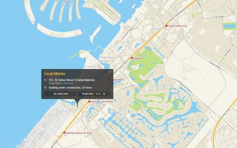 Dubai Marina is an ultra-modern district with a well-developed infrastructure. Sheikh Zayed Road (E11) and Harun Al Sabkha (D59) provide the exit to all four directions from the building.