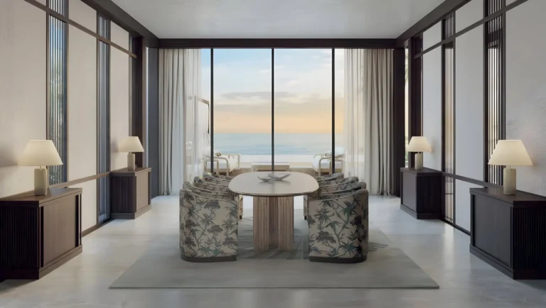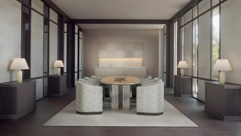 Located on the shoreline of Raha Island within Mina, Armani Beach Residences is a limited collection of 41 ultra-luxury villas developed by RAK Properties in collaboration with Armani/Casa. The estate sits directly on the waterfront within a master-planned marina district, integrating private beach access and landscaped terraces.