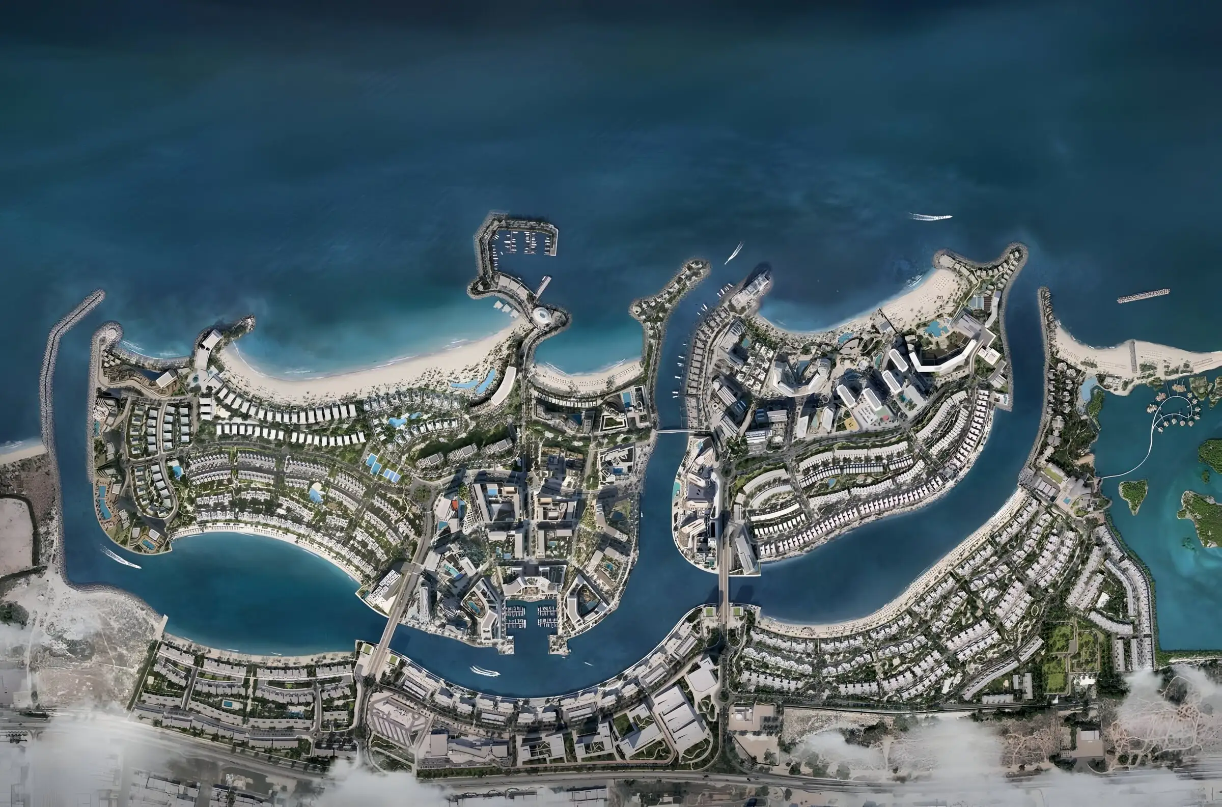 The project is located on Raha Island within Mina, Ras Al Khaimah, directly on the beachfront and approximately 25 minutes from RAK Intl Airport and 60–75 minutes from Dubai.