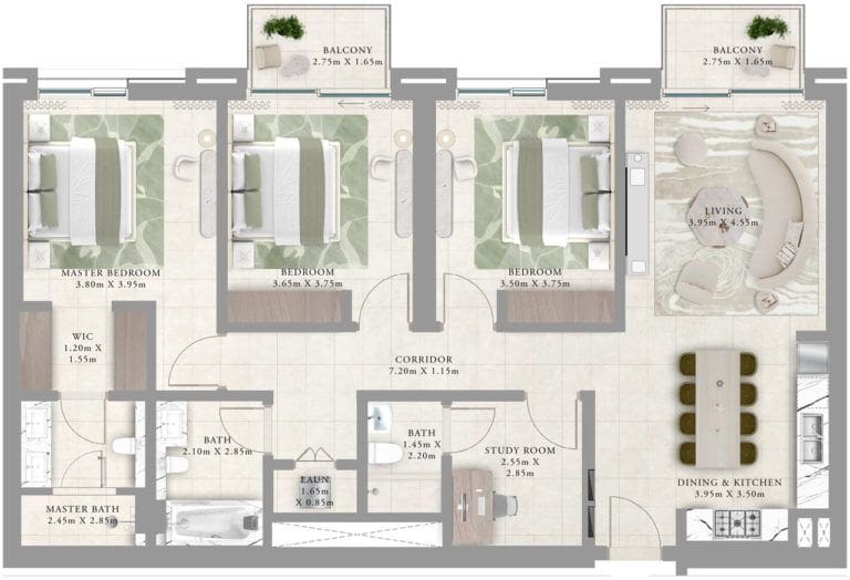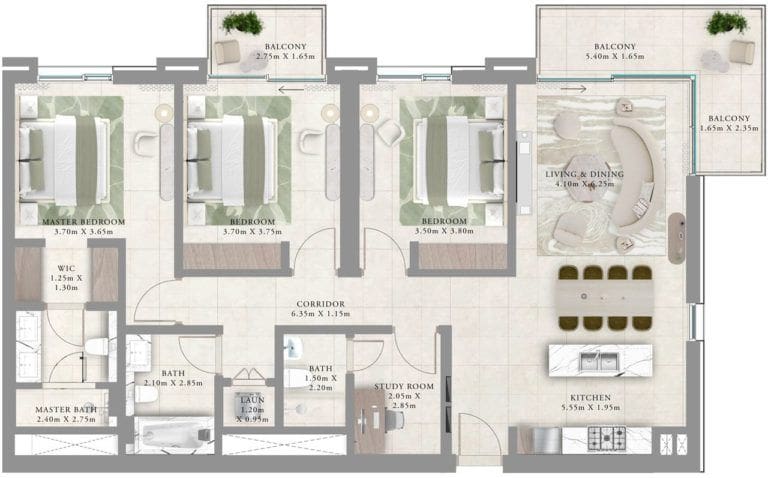 В каждой резиденции — 1–3 балкона, где жильцы смогут отдыхать на свежем воздухе и любоваться живописными пейзажами. В апартаментах с тремя спальнями будут кабинет для работы или учебы и прачечная.