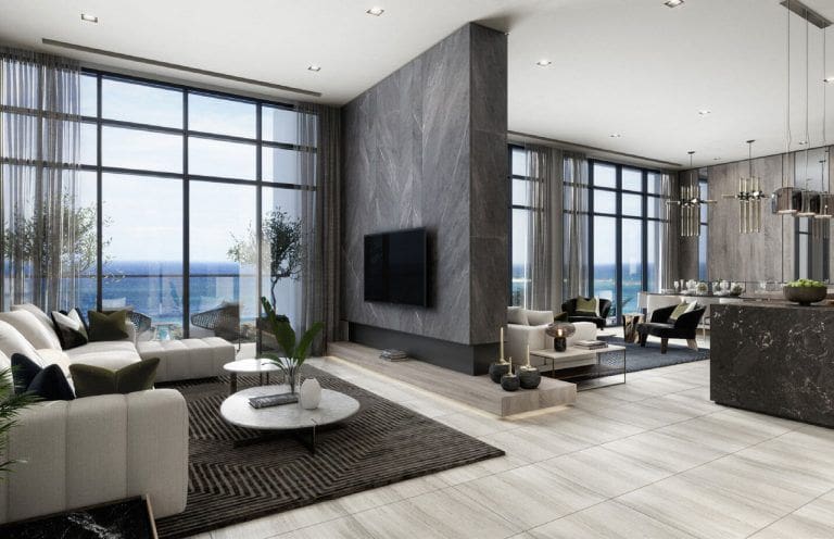 В здании можно приобрести студию, апартаменты с 1, 2 или 3 спальнями. Все жилые помещения отличаются большими террасами и высокими потолками. Минимальная площадь апартаментов – 436 кв. ф. (40,5 кв. м.). Во всех помещениях полы из мрамора и итальянской керамической плитки.