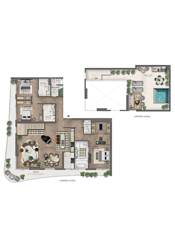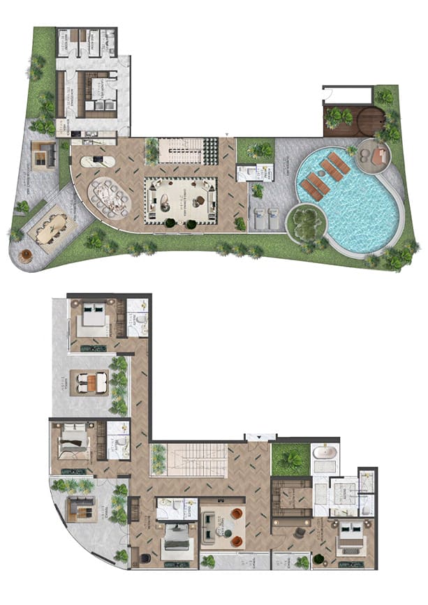 Площадь недвижимости варьируется от 70 до 848 кв. м. Интерьеры будут выполнены в стиле ар-деко, где натуральные текстуры сочетаются с ретро-оттенками. В кухнях — премиальная европейская техника. В некоторых резиденциях предусмотрены комнаты для персонала, а в брендированных резиденциях и пентхаусе — частные бассейны и террасы.