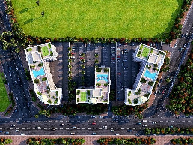 В трех шестиэтажных зданиях в общей сложности находится 384 апартаментов с одной спальней и 18 студий.