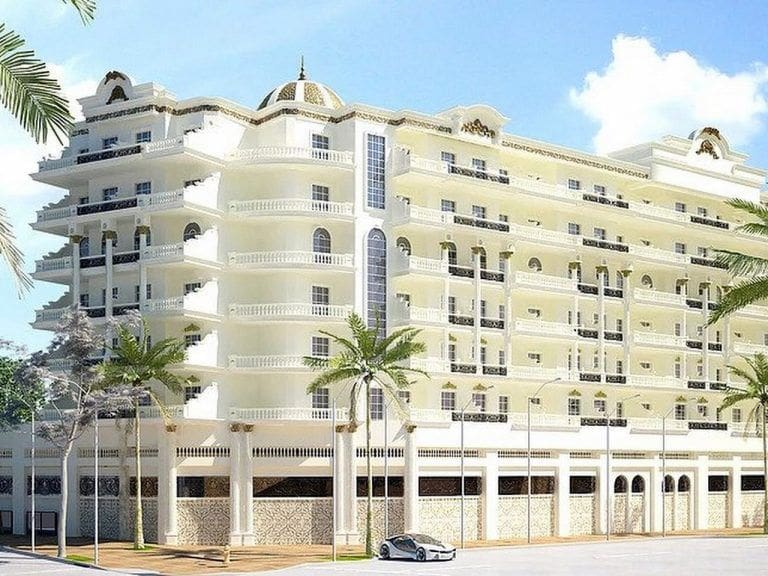 В самом здании пол в вестибюле выложен мрамором и гранитом. Архитектурный дизайн фасада сочетает в себе средиземноморский и арабский стили, с золотыми куполами на крыше и блестящим белым текстурным покрытием. В здании есть скоростные лифты, обеспечивающие легкий доступ как с первого этажа, так и с подиума на все этажи. Есть стойка регистрации и роскошный вестибюль.