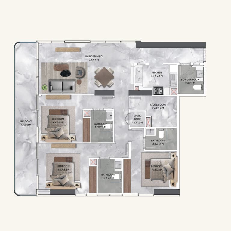 В проекте представлены апартаменты класса люкс с 1, 2 и 3 спальнями, с разнообразными планировками, террасами и современными интерьерами, созданными для комфортной семейной жизни.