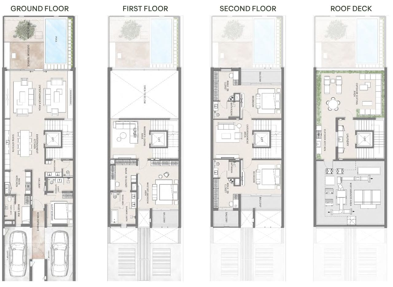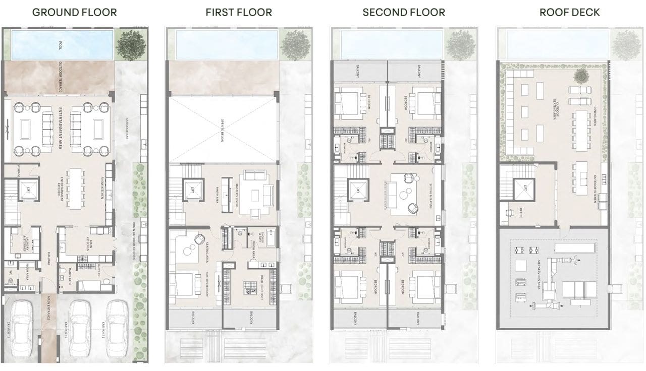 В дополнение к этому, владельцы таунхаусов с 5 спальнями будут также иметь в распоряжении кабинет на крыше, который идеально подходит для удаленной работы и/или учебы.