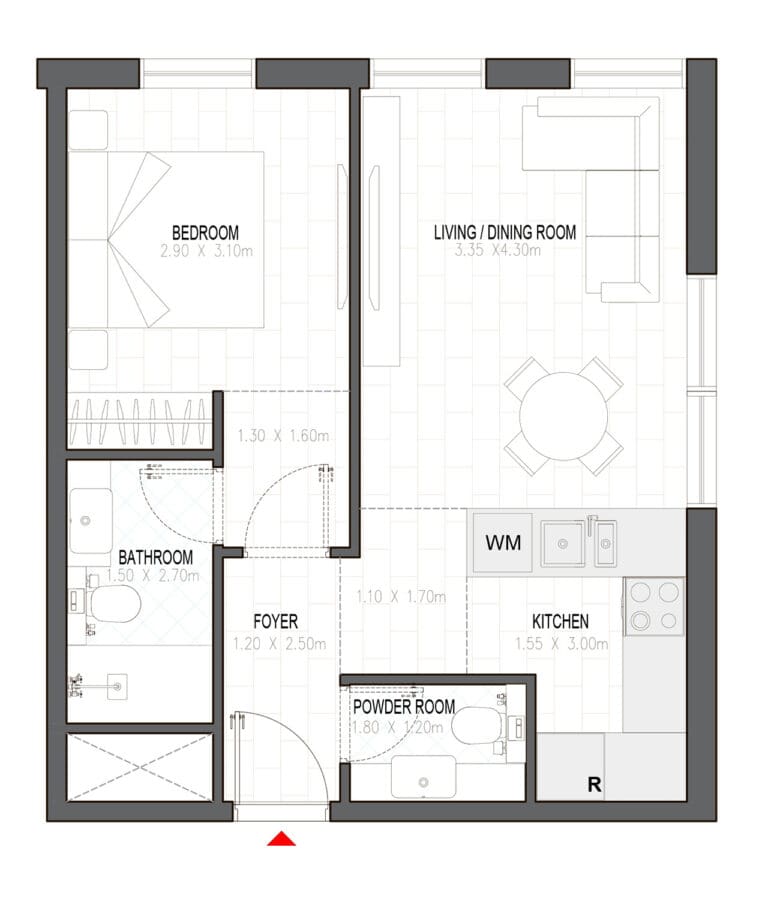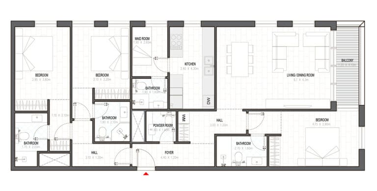 В Olfah — апартаменты с 1–3 спальнями площадью от 58 кв. м до 294 кв. м. Планировки включают прачечные, а в объектах с 3 спальнями — еще и комнаты для персонала.