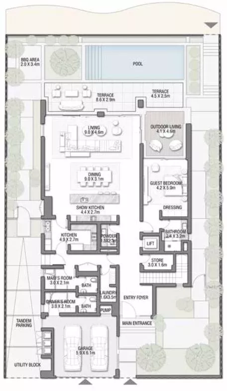 В комплексе представлены элитные виллы с 5-6 спальнями площадью от 680 кв. м до 784 кв. м. Планировки включают частные бассейны с зонами для отдыха, террасы и лаунджи на крыше, балконы, обеденные зоны на открытом воздухе, барбекю-зоны, дамские комнаты, прачечные, кладовые, гардеробные, демонстрационные кухни, комнаты для водителей и персонала, лифты и гараж. В некоторых резиденциях дополнительно предусмотрены кабинеты.