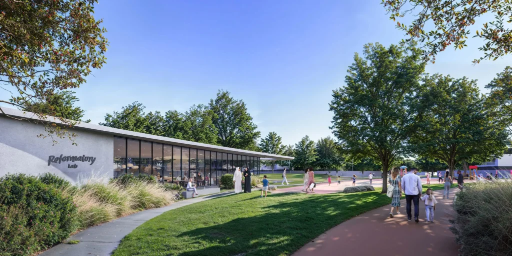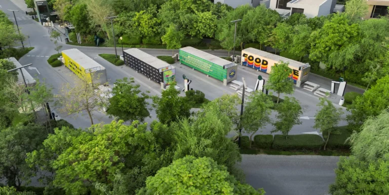 A vibrant community hub offering a variety of gourmet food trucks and casual dining options, creating a lively social space for residents to gather and enjoy.