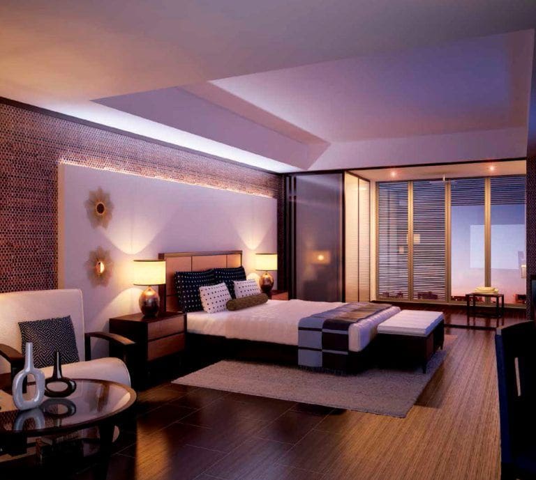 Floors 15 through 25 feature one-bedroom hotel rooms ranging in size from 843 sq. ft (78 sq. m) to 1,048 sq. ft (97 sq. m). Two-bedroom units can also be purchased and have a minimum size of 1,369 sq. ft (127 sq. m). Properties include a home theatre with access to Paramount’s movie library.