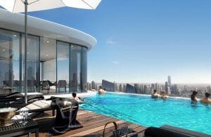 Floors 26 through 63 feature residential studios and one- to three-bedroom apartments. Units range in size from 520 sq. ft (48 sq. m) to 1,477 sq. ft (137 sq. m). The top floor features a panoramic pool with a sun terrace.