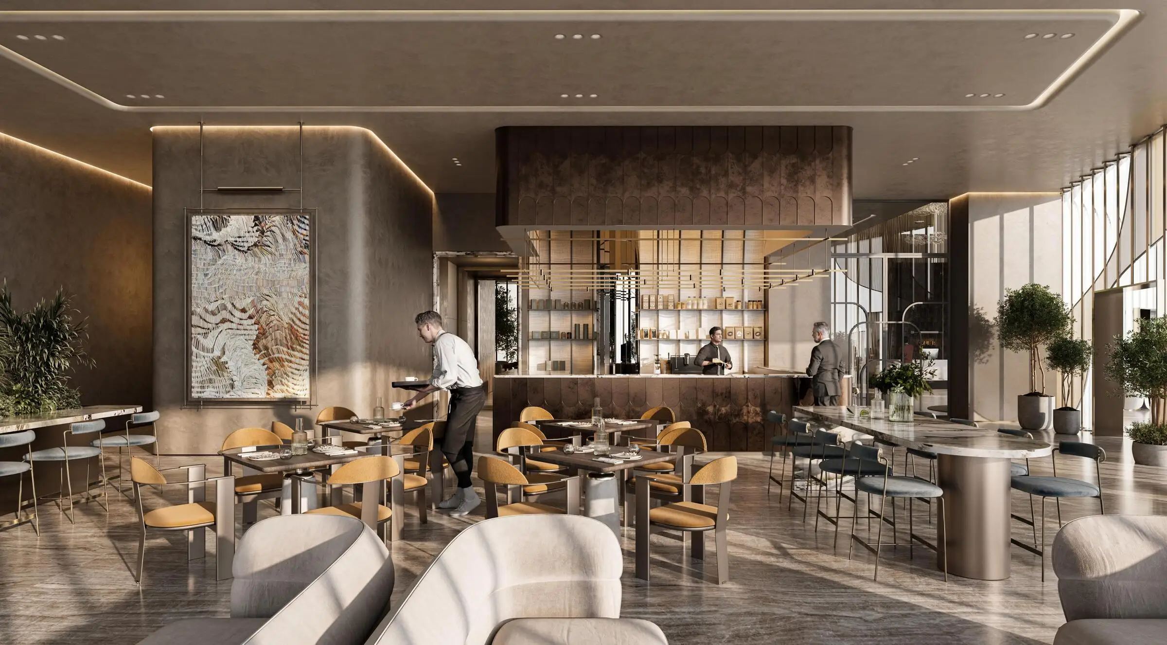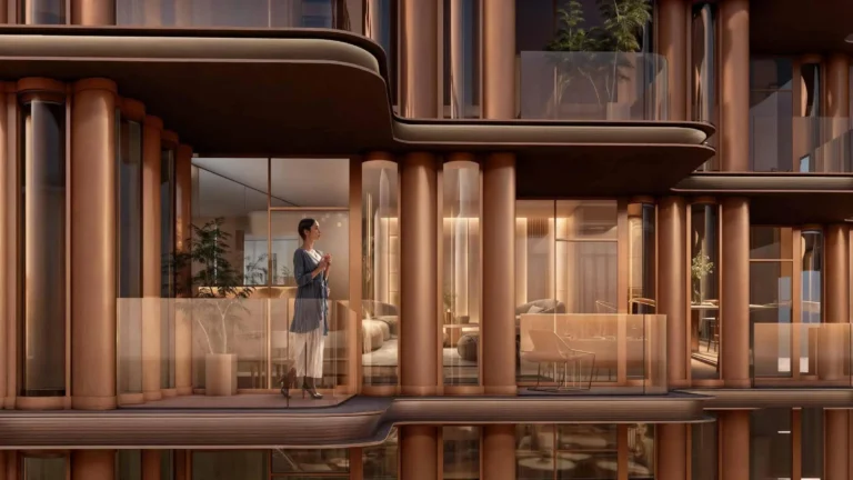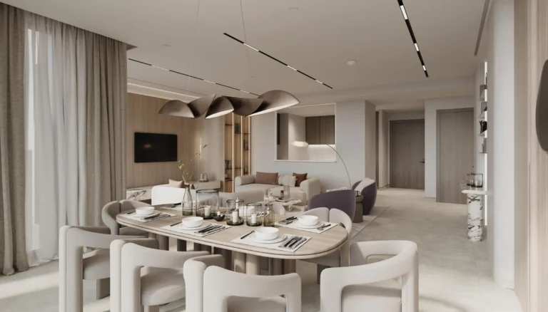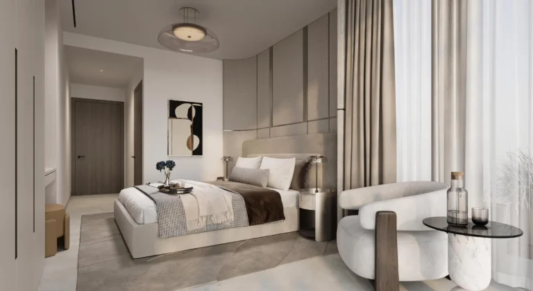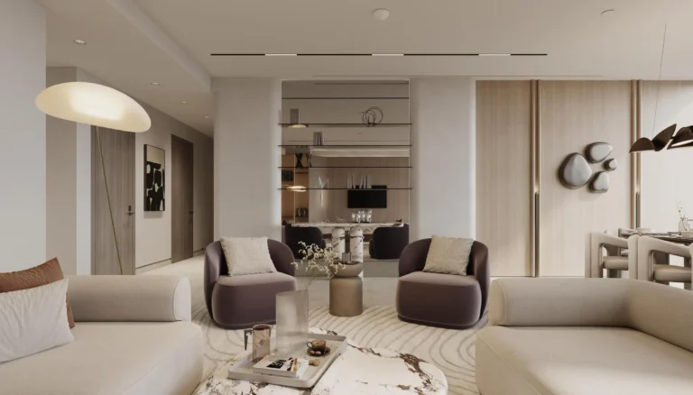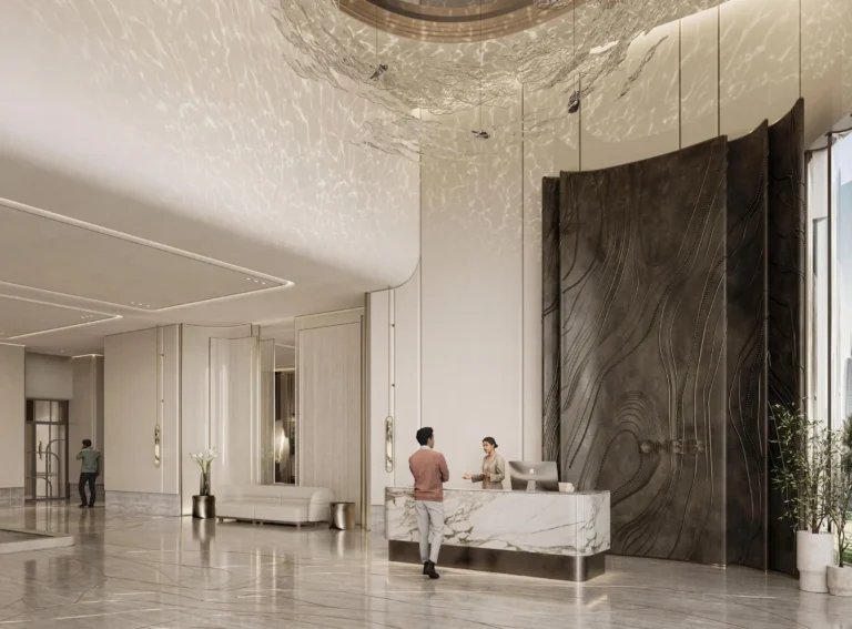 The project features a 47-storey tower with a curated selection of studios, one- to four-bedroom apartments, expansive duplexes, and a signature penthouse. Residences are designed with generous proportions, ranging from approximately 458 sq.ft to over 9,500 sq.ft. Interiors follow a sophisticated, contemporary aesthetic with luxury finishing and fully fitted modern closed kitchens.