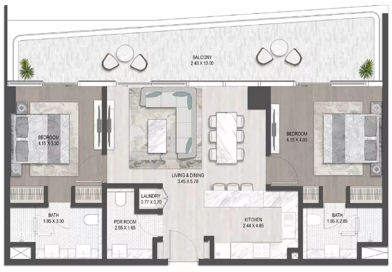 As of Q1 2024, an apartment and a penthouse can be acquired for a minimum of 2.16M (USD 588K) and AED 56.37M (USD 15.3M), respectively.