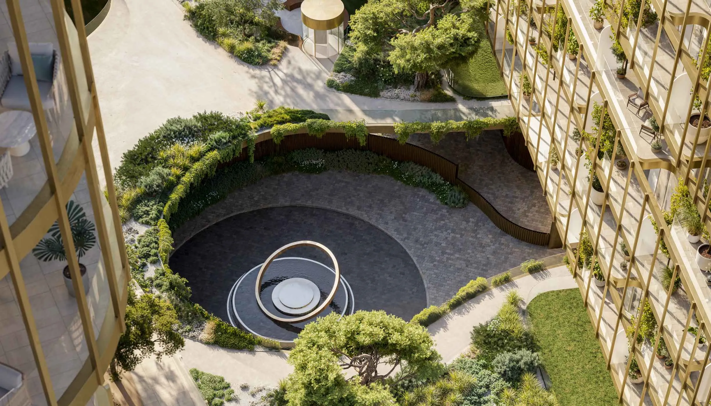 A calm garden level connecting the three towers, featuring shaded courtyards and mirror-like water elements that create quiet transitions between indoor and outdoor spaces.