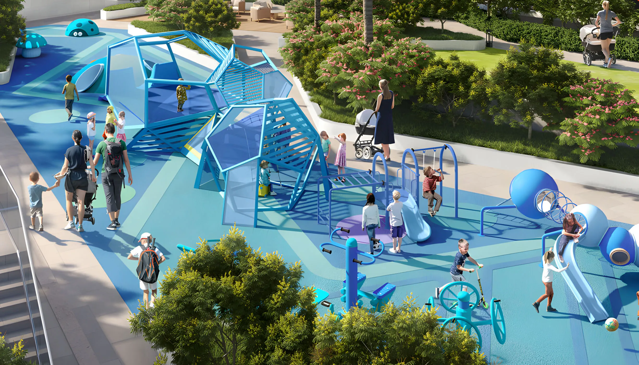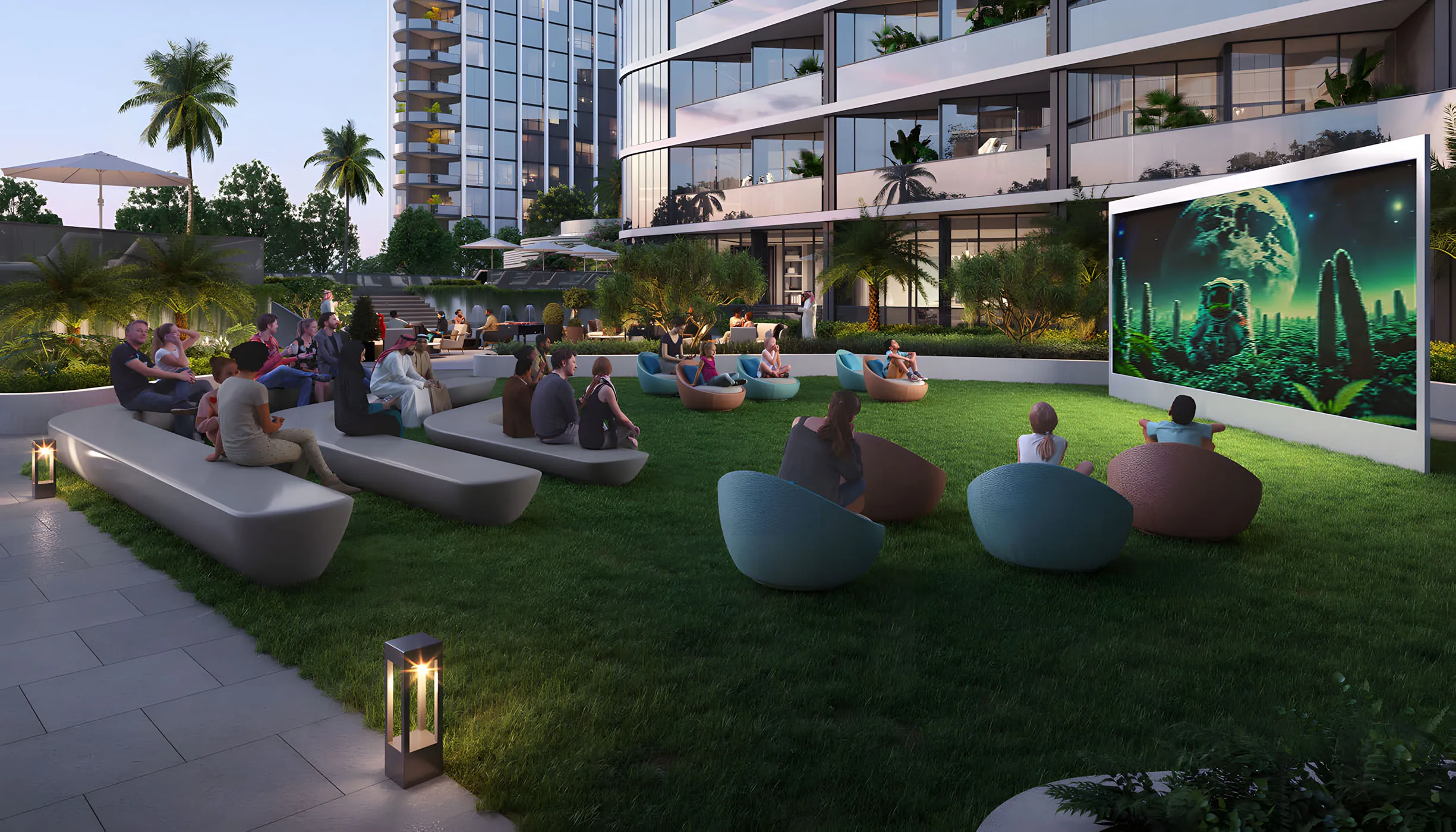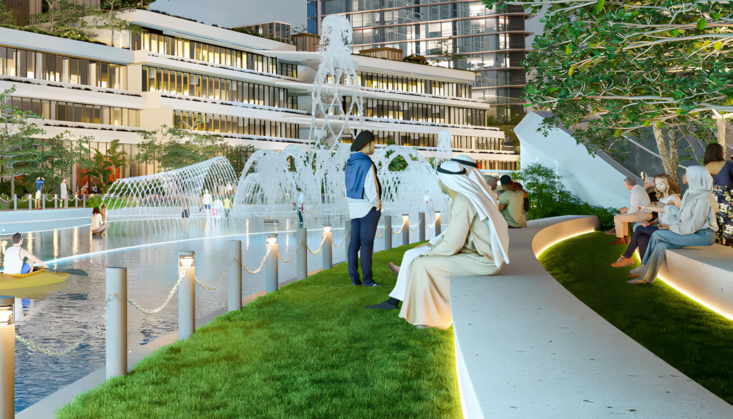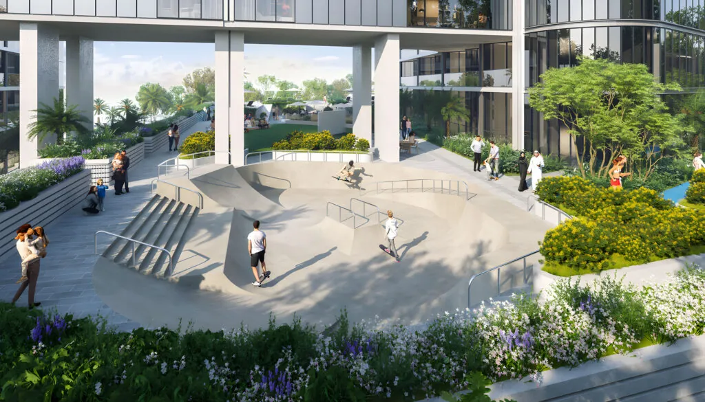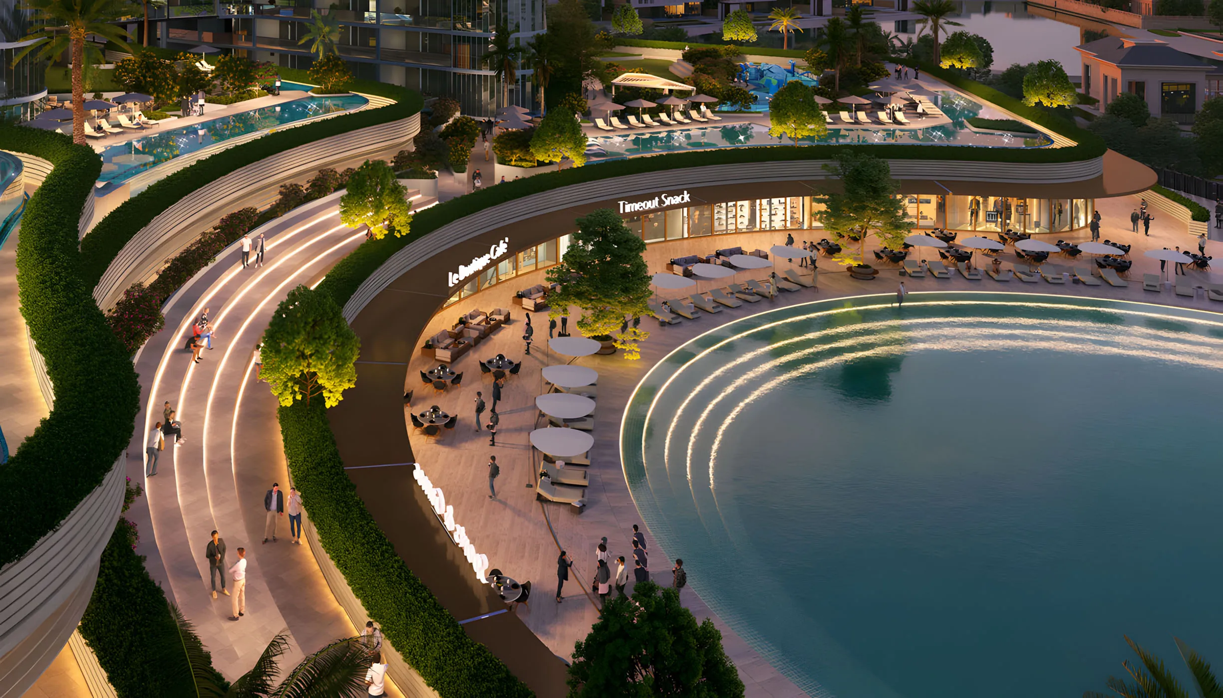 A stunning water feature within the central amphitheatre tranforms as shifting water levels create a dynamic ambience. More than just a visual centerpiece, it's a vibrant social hub where residents gather, connect, and unwind, immersing themselves in the tranquility and excitement of the space.