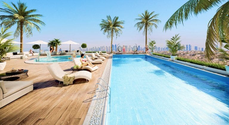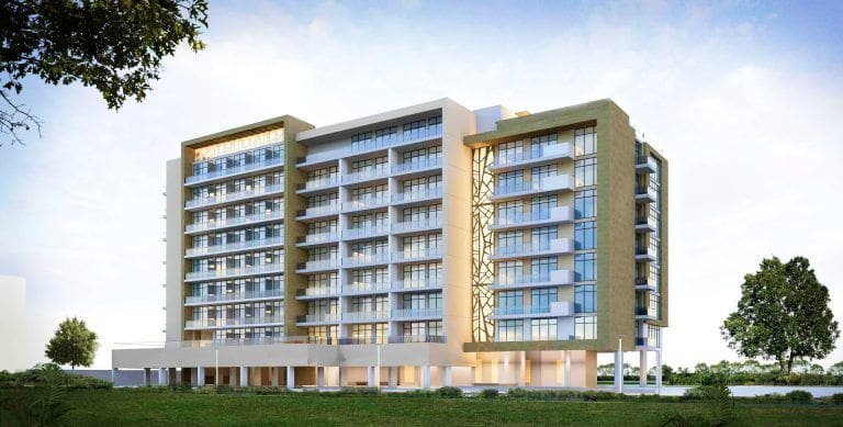 Properties include studios and one- and two-bedroom apartments that have a minimum size of 360 sq. ft. Studios have a starting price of AED 320,000 (USD 87,000), and apartments have a starting price of AED 475,000 (USD 130,000). Units have high-quality finishes, furniture, modern European equipment, and windows that overlook a park with an abundance of lush green spaces.