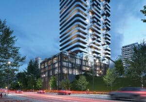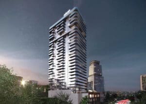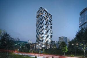 The 32-storey tower offers 278 residences: studios from 28.4 sq. m, 1–3 bedroom apartments, and exclusive 4-bedroom units of up to 282.8 sq. m. All apartments feature panoramic windows and balconies.