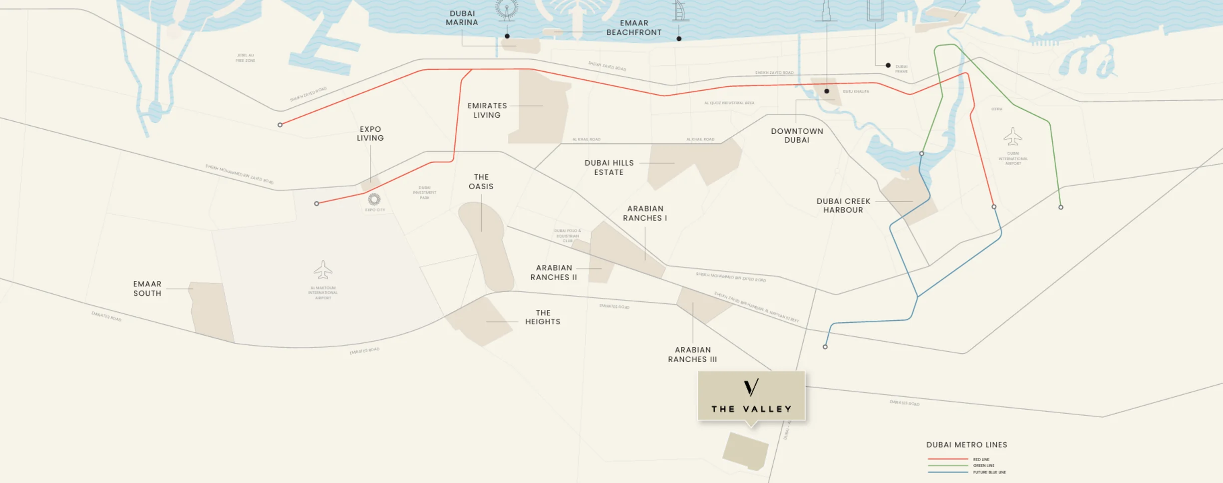 The Valley is situated at the intersection of Jebel Ali – Lehbab Road and Al Ain – Dubai Road. Therefore, residents will have easy access to some of the key areas of the emirate. In a short 14-minute drive, DAMAC Hills 2 can be reached, while Arabian Ranches 2 is a 25-minute drive away.