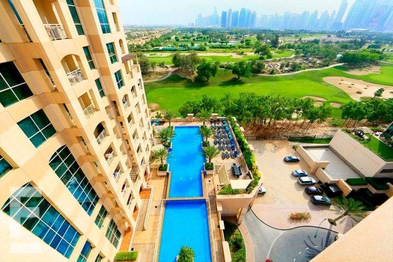 Golf Tower is an apartment complex consisting of two towers, one with 26 floors and the other with 31 floors. The apartments have views of the nearby golf course and tennis club. The towers are connected by a common podium that offers a variety of amenities, including a swimming pool, barbecue area, and children’s play centre. The annual rental cost for a furnished one-bedroom apartment, with an area of 89 sq. m (962 sq. ft), is AED 100,000 (USD 27,225). The purchase price of a unit starts at AED 1,350,000 (USD 367,541).
