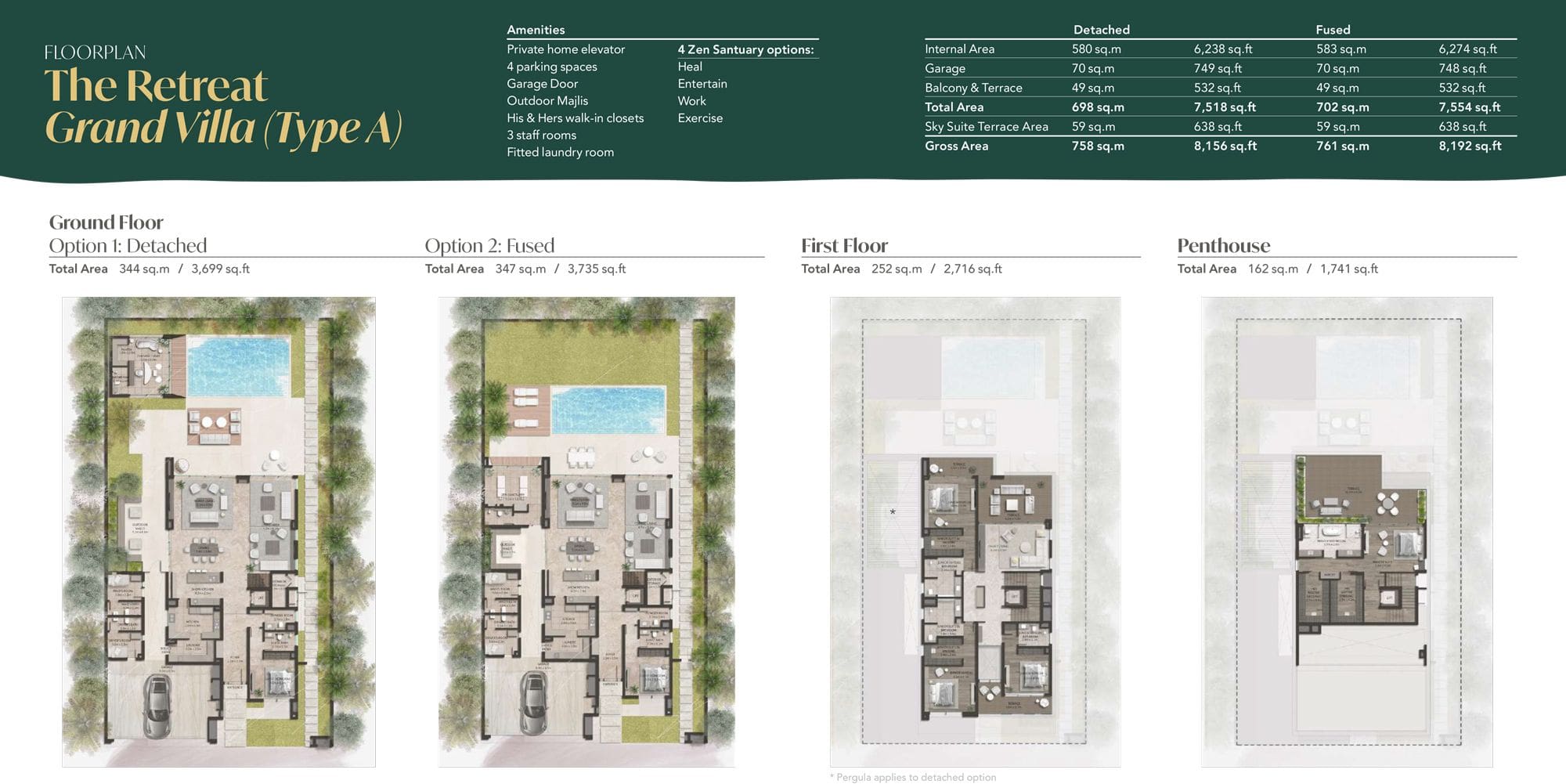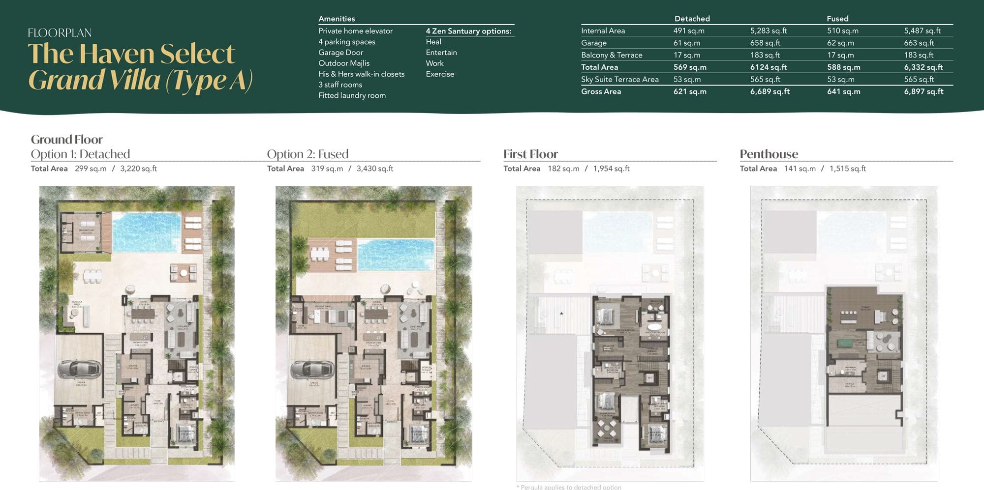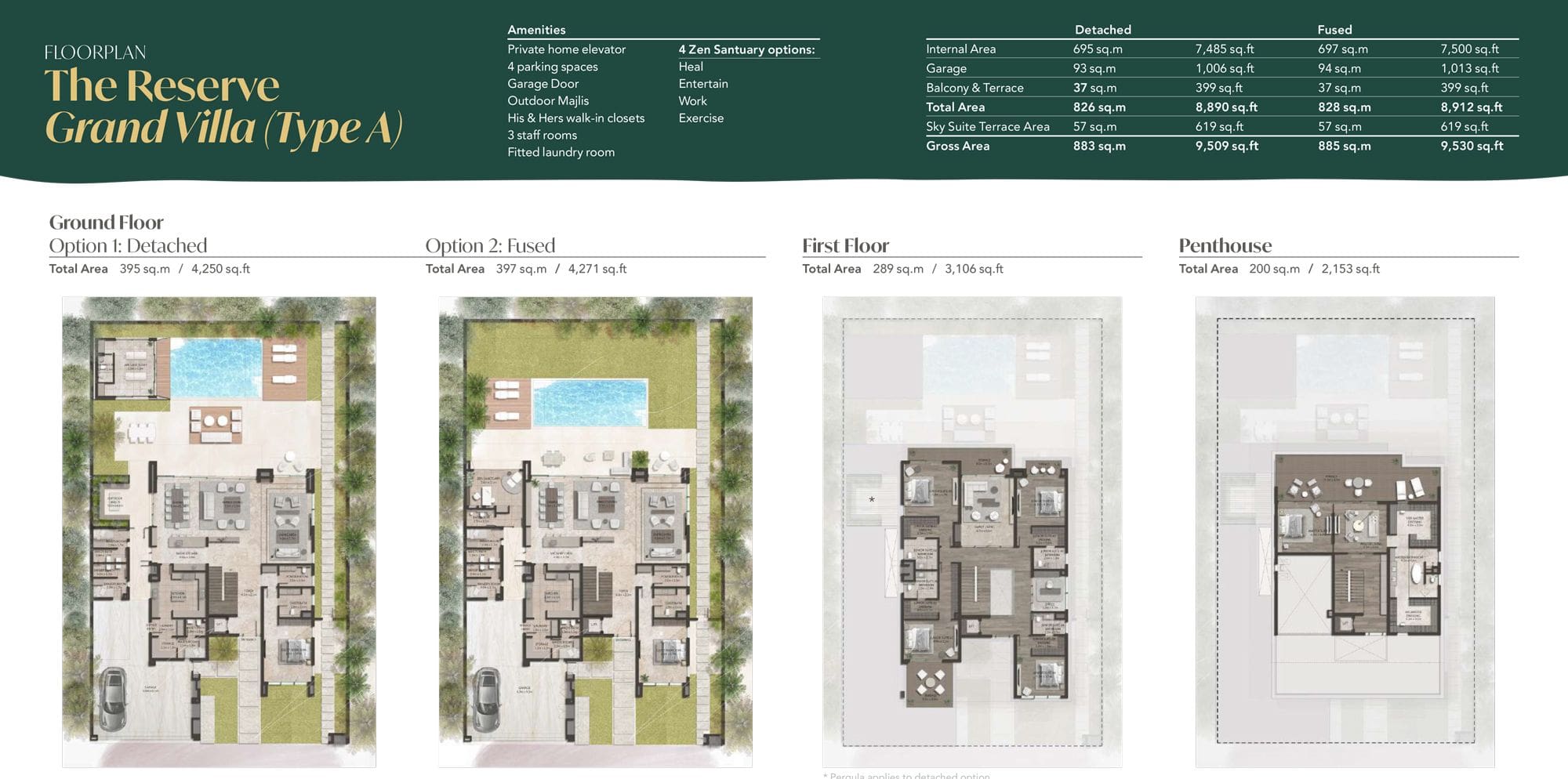 The total size of the 3-storey high-end Grand Villas ranges from 5,908 sq. ft–9,530 sq. ft, depending on the chosen type. There are 4 variations to choose from: The Retreat, The Reserve, The Haven Select and The Haven. The ground floor comes as either fused or detached; it’s up to you to decide how you want your space to look. You will able to benefit from the following key features: