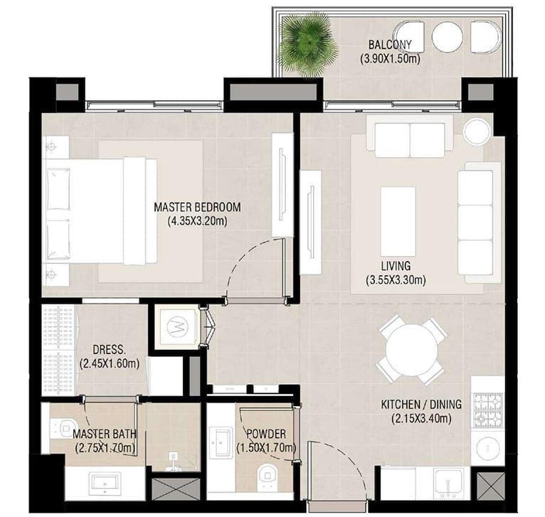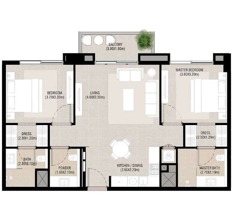 Apartment sizes range from approximately 662 sq. ft for 1-bedroom units to 1,584 sq. ft for 3-bedroom units. Each home features open kitchens, spacious balconies, and master bedrooms with en-suite bathrooms and built-in wardrobes. The architecture emphasizes clean geometry and warm neutral tones, while interiors are bright, functional, and thoughtfully planned.