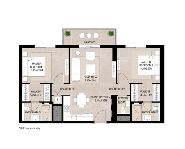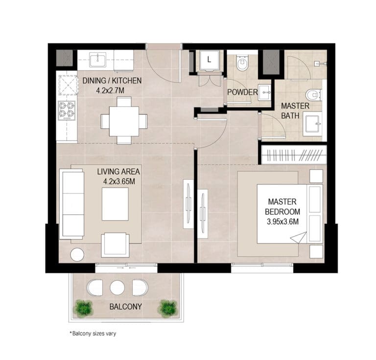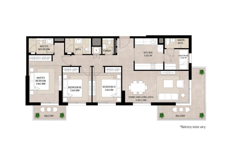 Properties in the project are made up of premium 1–3 bedroom apartments and 3-bedroom duplexes with spacious balconies and terraces. The apartments are equipped with high-quality German-made kitchen appliances.