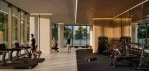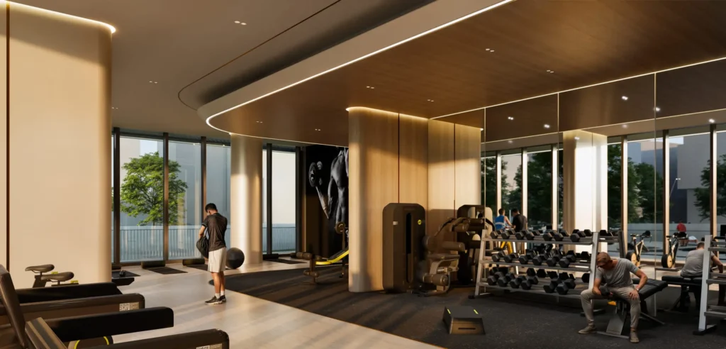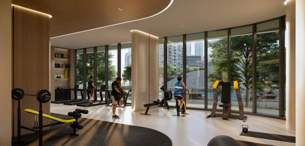 The development features a sophisticated leisure deck equipped with an adult swimming pool, a dedicated children’s pool, and a high-end gym, all designed to offer a resort-style experience within a private residential setting.