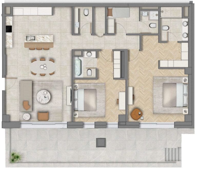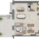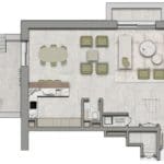 Open-plan kitchens are combined with living and dining areas. The bathrooms have expensive plumbing. There is access to either a balcony or a wide terrace, depending on the residence type. Floor-to-ceiling windows overlook a green park or boulevard.