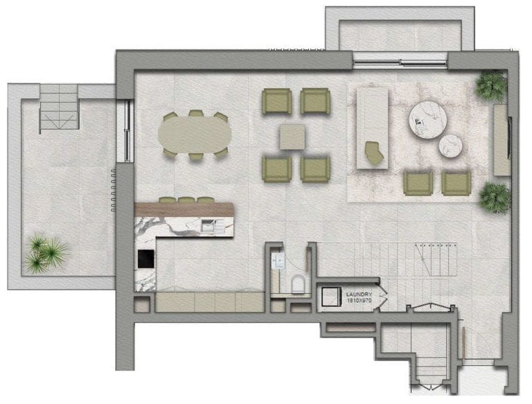 A sprawling green lawn brimming with palm trees, landscaping and shrubbery create a calm and comforting atmosphere. Walking alleys and bicycle paths are expertly hidden in the shade of the greenery, providing refreshingly cool spaces even on the hottests of days. There is a special barbecue patio for picnics and grilling out.