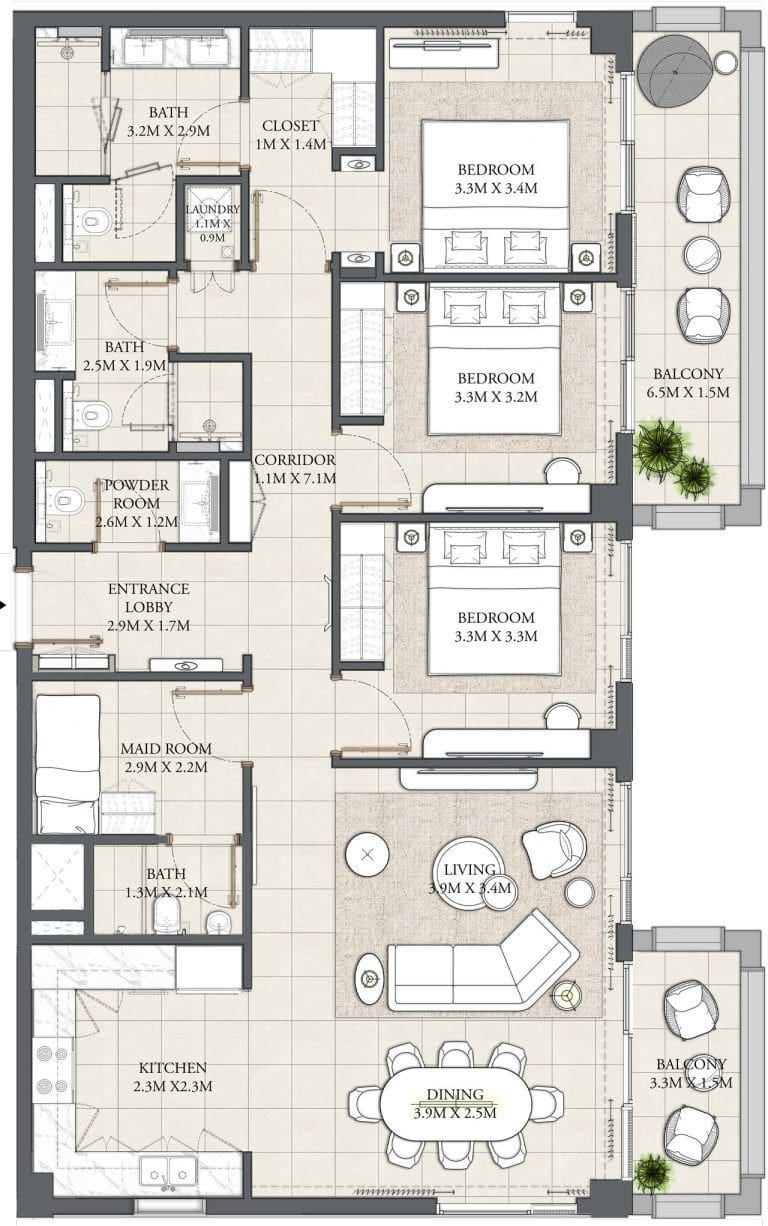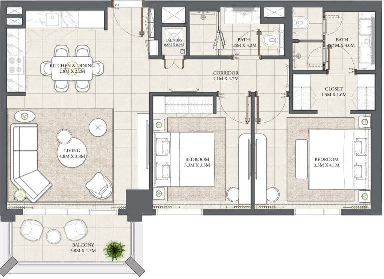 两座摩天大楼组成的综合体提供135套时尚公寓,面积从615平方英尺到1,701平方英尺不等(57-158平方米)为1-3间卧室。布局包括俯瞰下方公园的阳台,以及洗衣房和更衣室—3居室住宅将包括一间额外的佣人房。