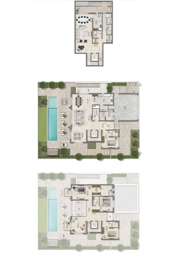 这些豪华的4-6居室别墅,建筑面积7,269至12,777平方英尺(675-1187平方米),占地9,174至16,000平方英尺(852-1486平方米),提供卓越的滨水生活方式。提供三种独特建筑风格,每栋别墅均配有私人泳池、双厨房(备餐厨房和展示厨房)、正式会客厅以及员工宿舍,包括带有车库通道的专用司机宿舍。部分住宅还设有带厨房的地下室生活区和带私人露天平台的屋顶休息室,进一步提升日常生活体验。