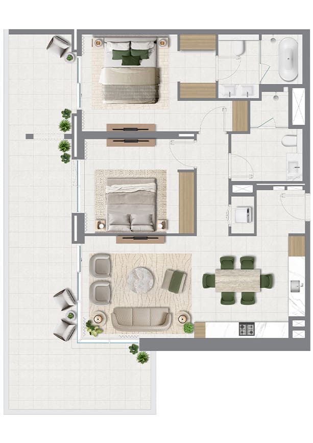 该项目提供1至3居室公寓,起价为120万迪拉姆(约236万人民币)。开发商提供80/20的付款计划。