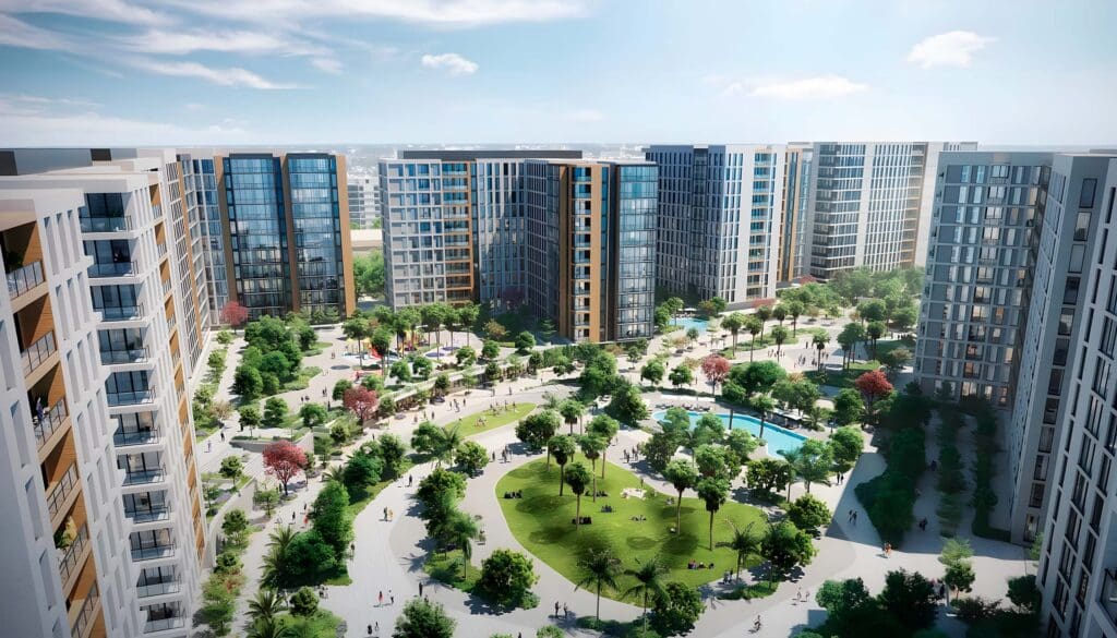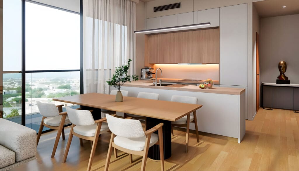 Alef Group在沙迦Muweilah推出的Olfah项目,包括12座优雅建筑中的1至3居室公寓。这个灵感来源于自然的社区提供的住宅面积从625到3169平方英尺不等(58-294平方米),特色包括高端装修、专用洗衣房和私人阳台。该开发项目拥有世界级设施,包括无边泳池、体育设施和园景花园,完美融合了城市便利与自然宁静。.
