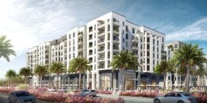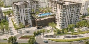 Maryam Gate Residences is a complex that consists of six low-rise apartment buildings. Properties include studios and one- to three-bedroom apartments that range in size from 377 sq. ft. to 2,318 sq. ft. The building offers a courtyard, a swimming pool, and recreation areas. Units have a starting price of AED 365,000 (USD 99,000).